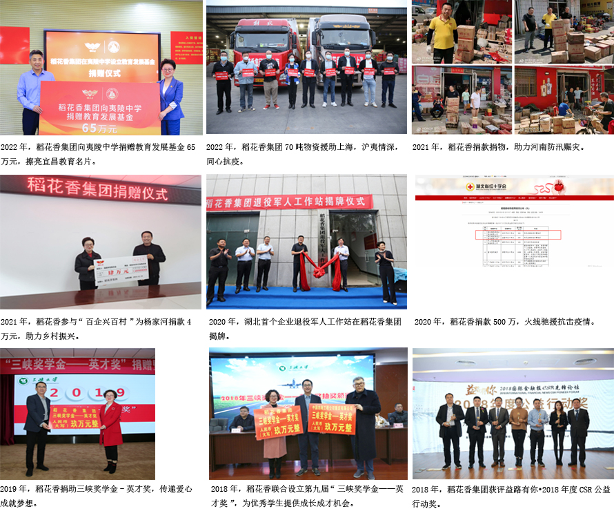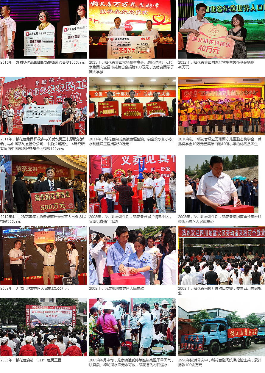 40年來,稻花香在加快自身高速發展的同時,積極踐行社會責任,投身公益事業,參與脫貧攻堅,助力鄉村振興,帶動百姓致富。集團舞活白酒龍頭,形成“一主三輔”產業集群新格局;以工業反哺農業,惠及一方百姓;發揮產業支撐和引領作用,帶動地方經濟發展和農民增收致富;加強培訓就業,增強農民“造血功能”,轉移剩余勞動力就業;在精準扶貧過程中,進行城鄉互聯、村企對接、結對共建,助推產城共建、產城共融,致富一方百姓,形成了政企農三方共贏、相互促進、共同發展的良好局面。積極捐款捐物,參與全民抗疫阻擊戰,馳援河南防汛救災,彰顯了支柱企業的責任與擔當。